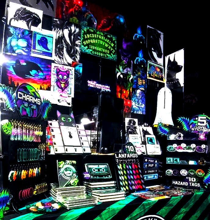 With over 20 years of customer service and vending since 2019, my eye-catching setup can be tailored to your event with 3, 6, and 8-foot table designs! I take pride in showcasing my handmade wares, artist-designed merch, and a unique, wild style that makes every convention memorable!Get ready.